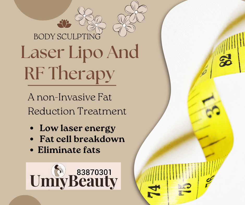 To break down localised fats deposits and to combat and eliminate the accumulation of fat in a that area of the body. Help to increase metabolism rate with slim method massage. RF (radiofrequency) energy , with lipo laser therapy (laser lipolysis) helps to destroy fats cells by some non-invasive heat. Results varies on individual body metabolism, age and some other factors. and usually can be seen next day of 1st sessions.
